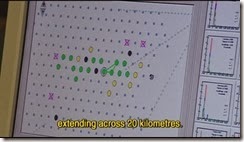 For example, here we see the footprint of a cosmic ray, which was recorded at more than twenty stations. extending across 20 kilometres. And here we see that this cosmic ray has an energy of 2 followed by 19 zeros electron volts. It would heat one gram of water about one degree, not even enough to make a cup of coffee.